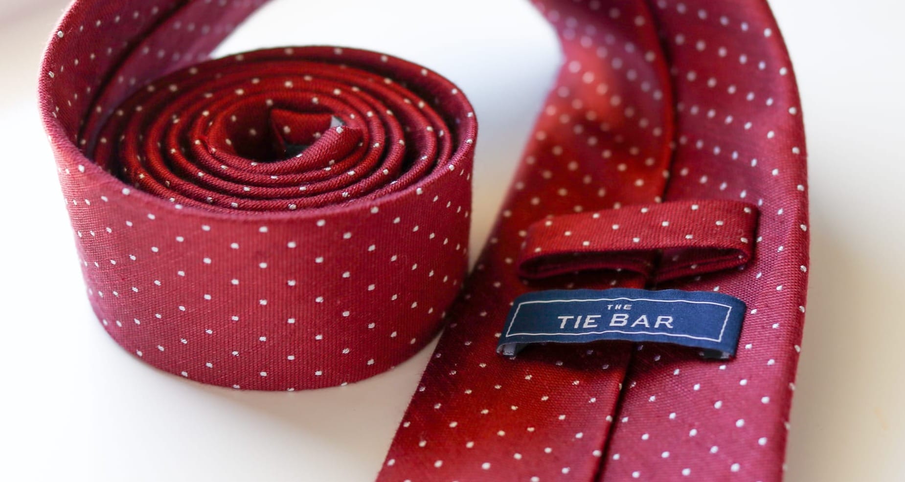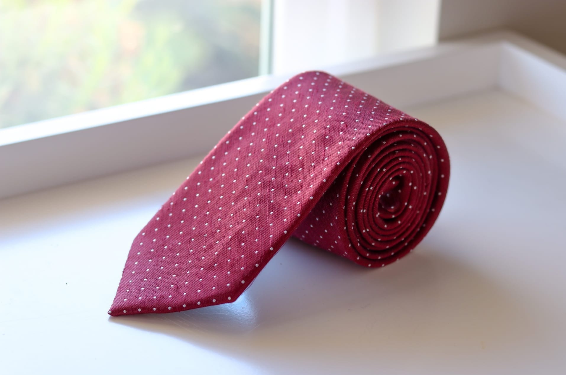 One is a solid-colored tie in a tasteful hue with a much smaller pattern (like a pin-dot tie). A classic burgundy red with off-white pin dots is a great option and can seldom lead you astray (see below).