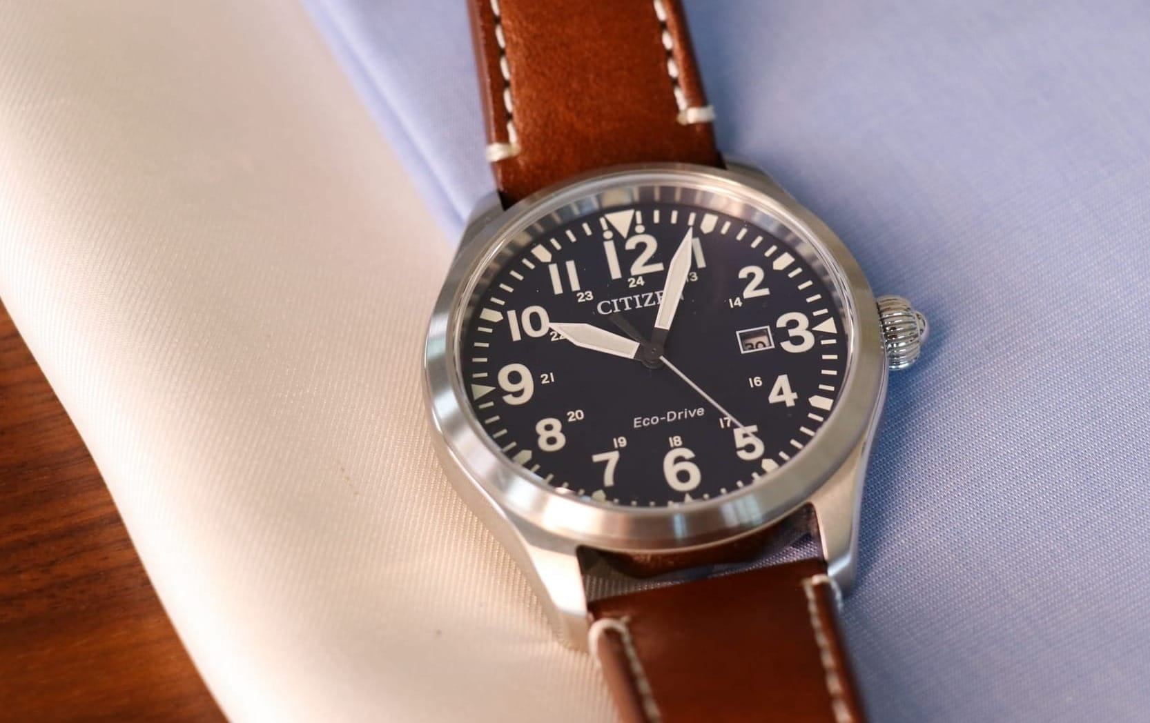 The Citizen Chandler is a field watch with military-inspired design features. It has a classic leather strap, so it's not a dress watch, but it can easily match any business or smart casual outfit.