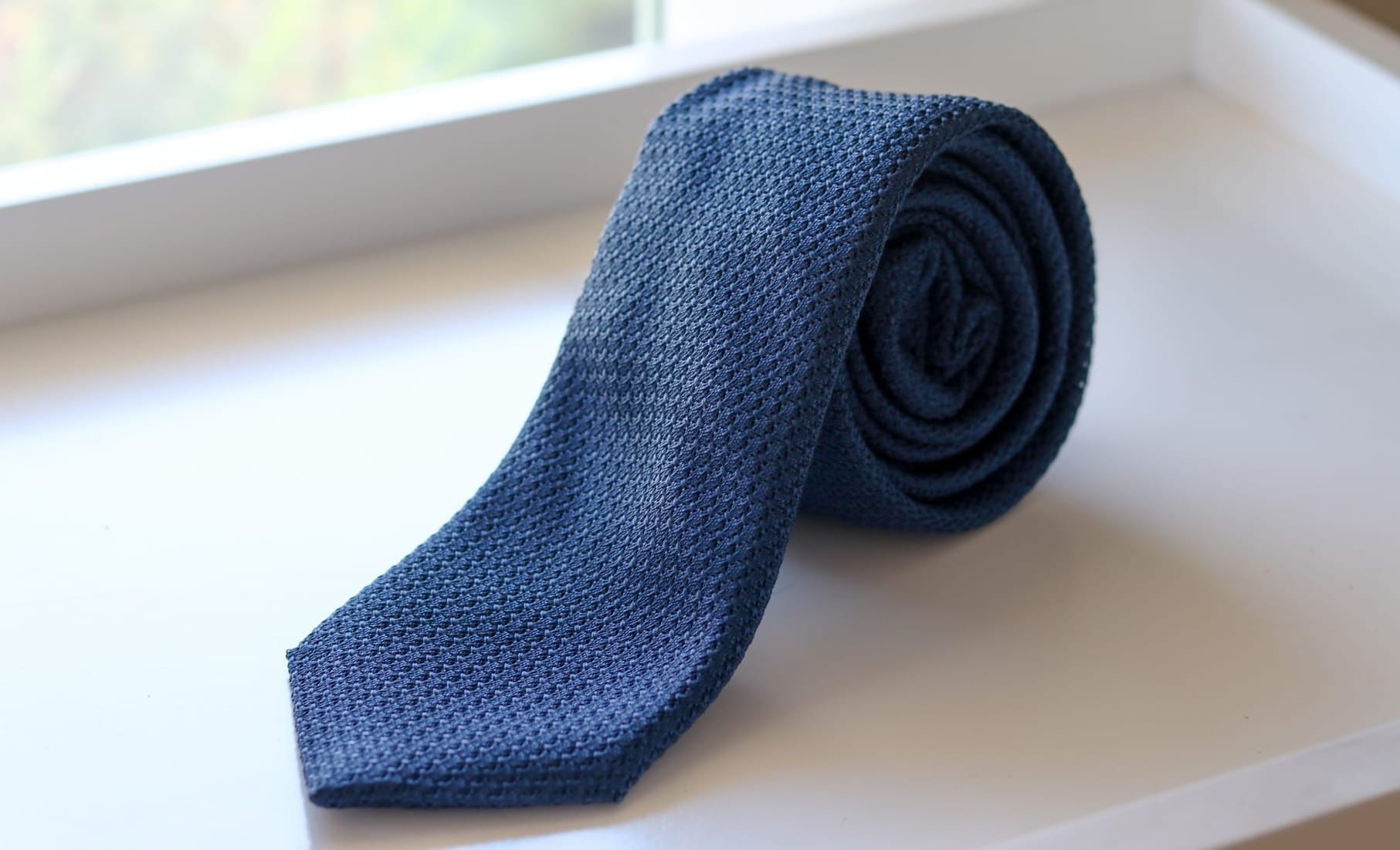 You can choose a solid color like navy blue or a bold striped design in deeper shades of color. Of course, if the flattened edges of knit ties don't appeal to you, a grenadine necktie in navy blue, emerald green, or burgundy red is also highly textured and versatile.