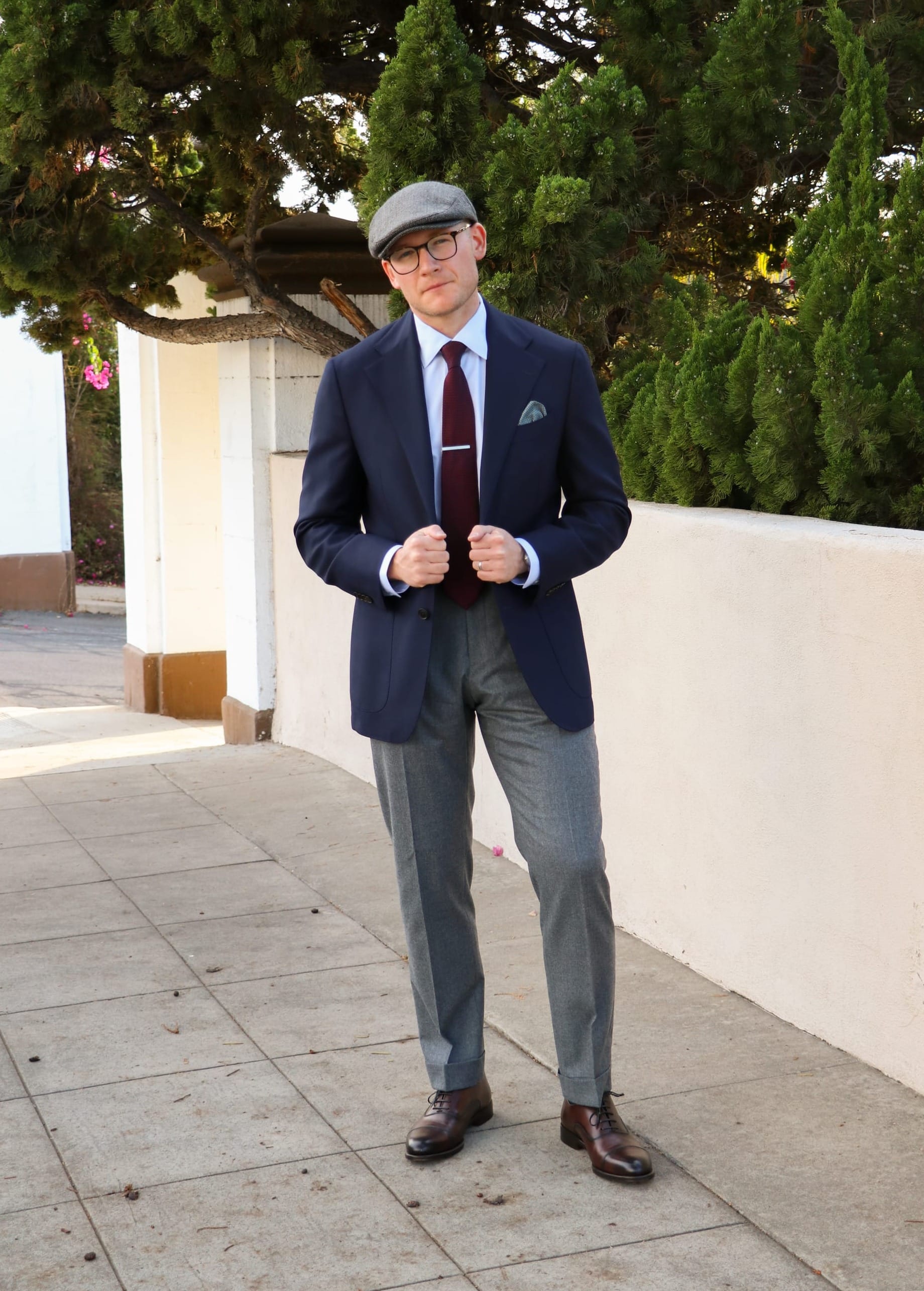 The navy blazer is in a beautiful wool hopsack, providing a subtle yet effective texture. It is paired over clean wool flannel dress pants, an ice blue Oxford-cloth dress shirt, and a textured burgundy grenadine necktie, harmonizing well with the other textures throughout the look.