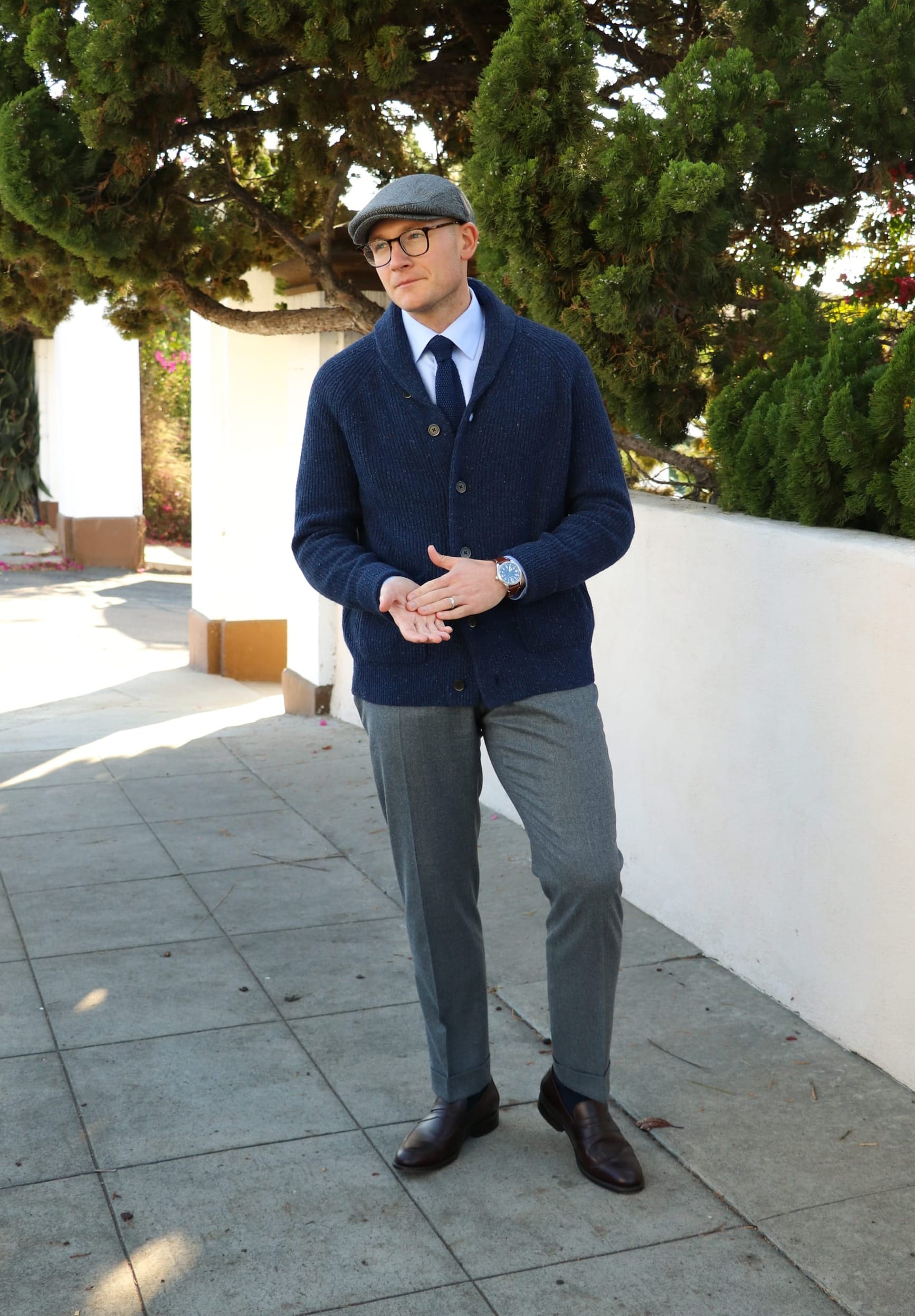 Here is one such example: a classic chunky shawl cardigan sweater dressed up with a casual knit necktie and wool flannel dress pants. Warm, cozy, and handsome, this look will always look festive and dapper for the fall and winter.