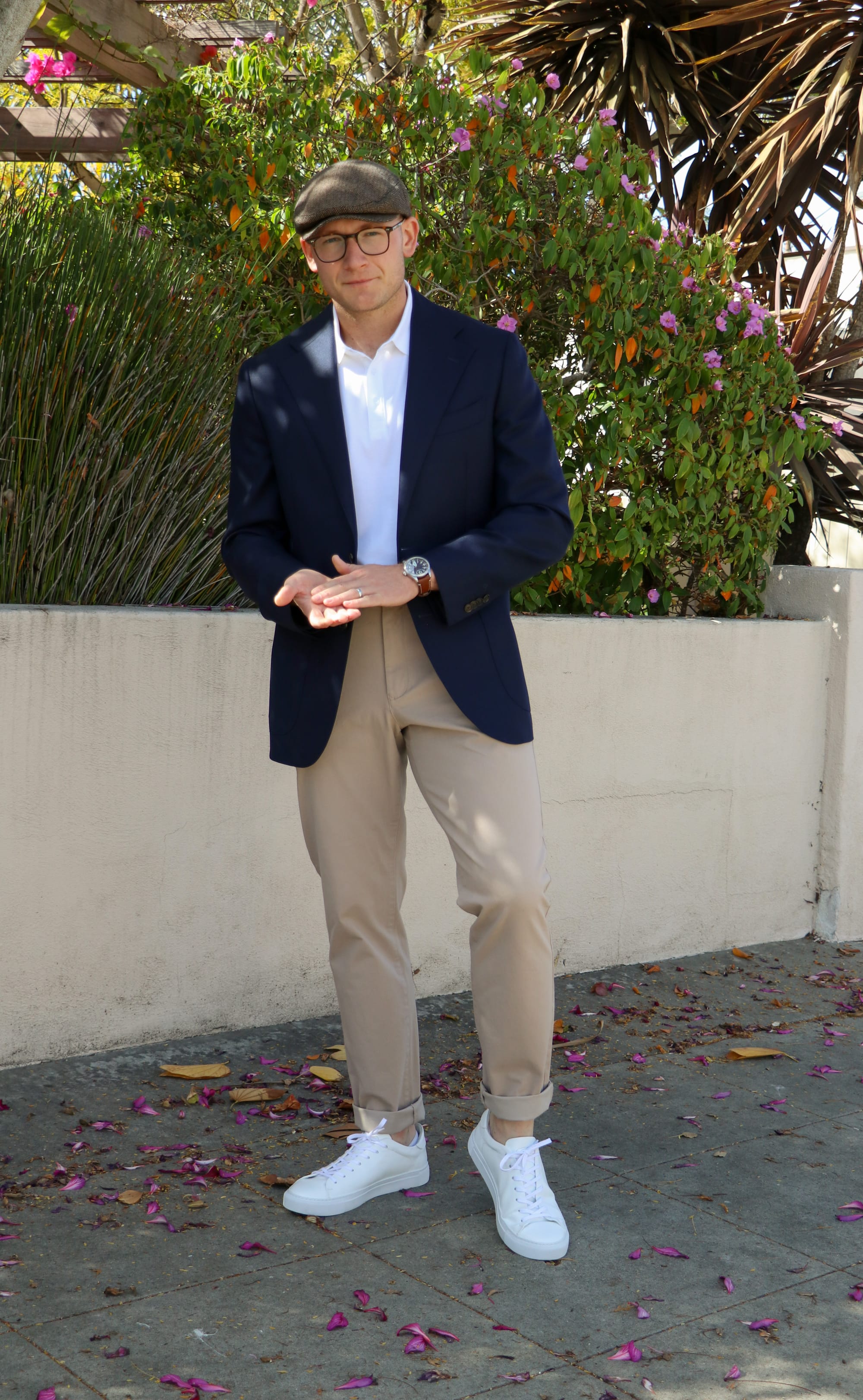Suppose you were to take a hopsack navy blue blazer and pair it with navy cotton-twill chinos or dress pants.
