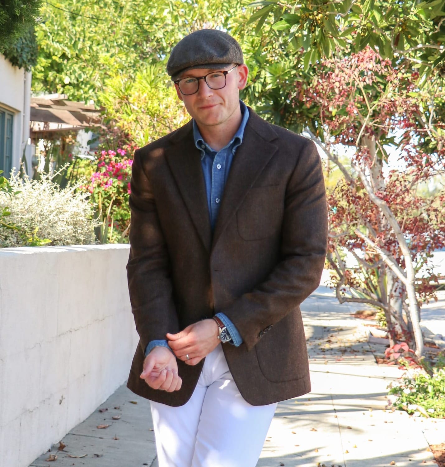 However, suppose the suit jacket has an intricate pattern, and the wool is a hopsack weave or something with an apparent texture; in that case, the nature of the suit jacket is already a little more casual than worsted wool (resembling a classic navy blazer), and therefore you could very well pull it off.