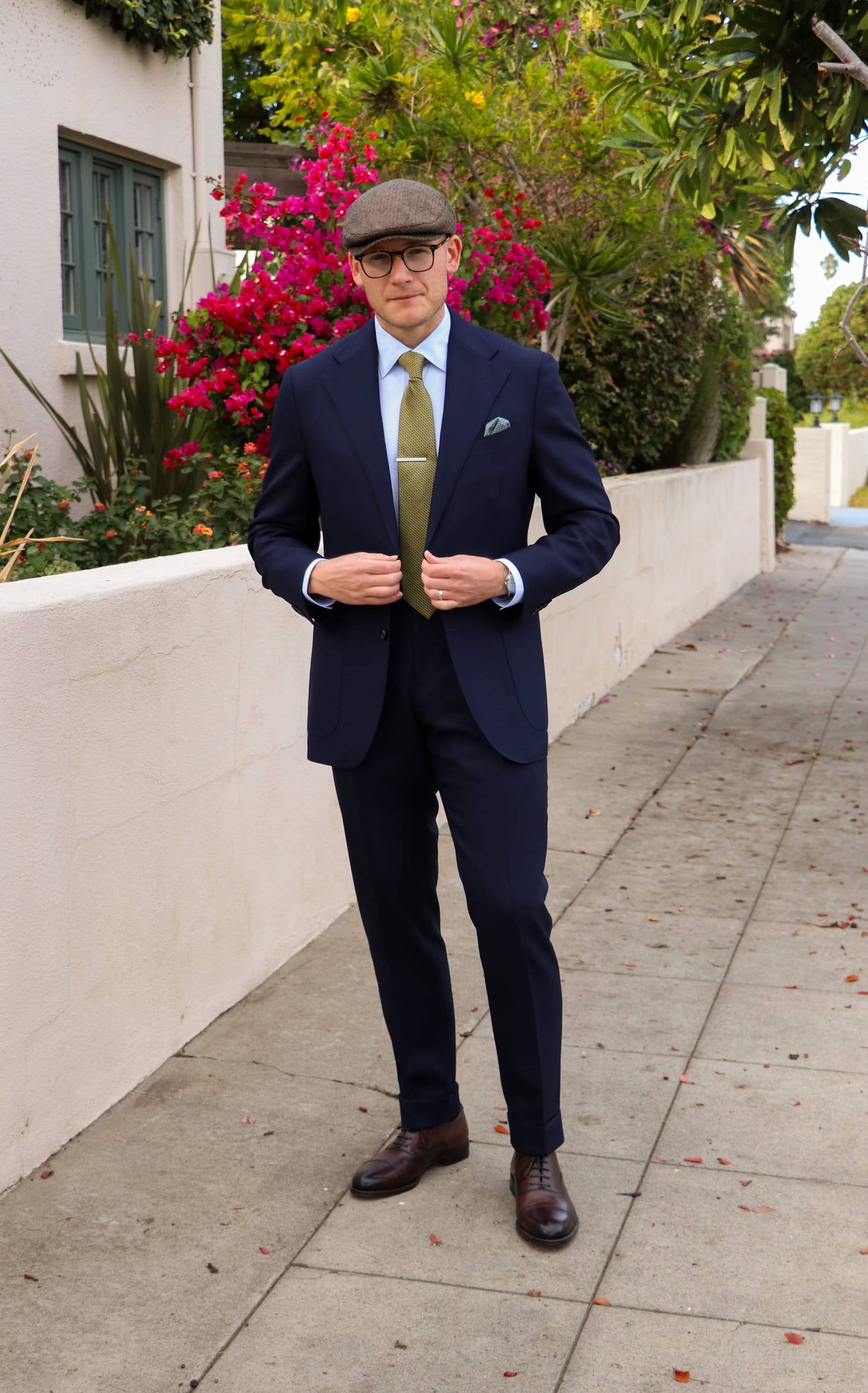 This full suit (featured above) is single-breasted with patch pockets, woven from hopsack wool, has a less structured design, and is a true navy blue.