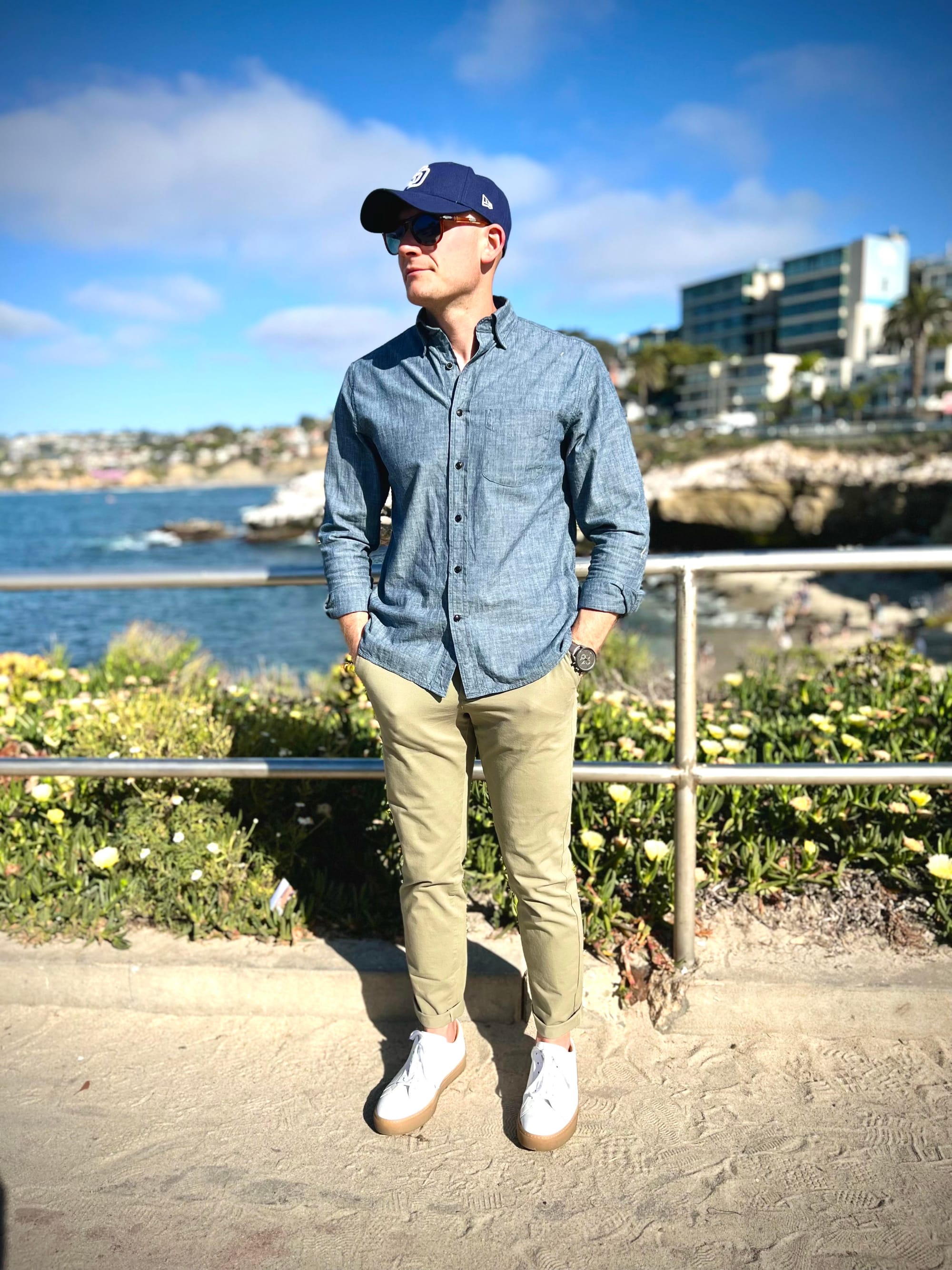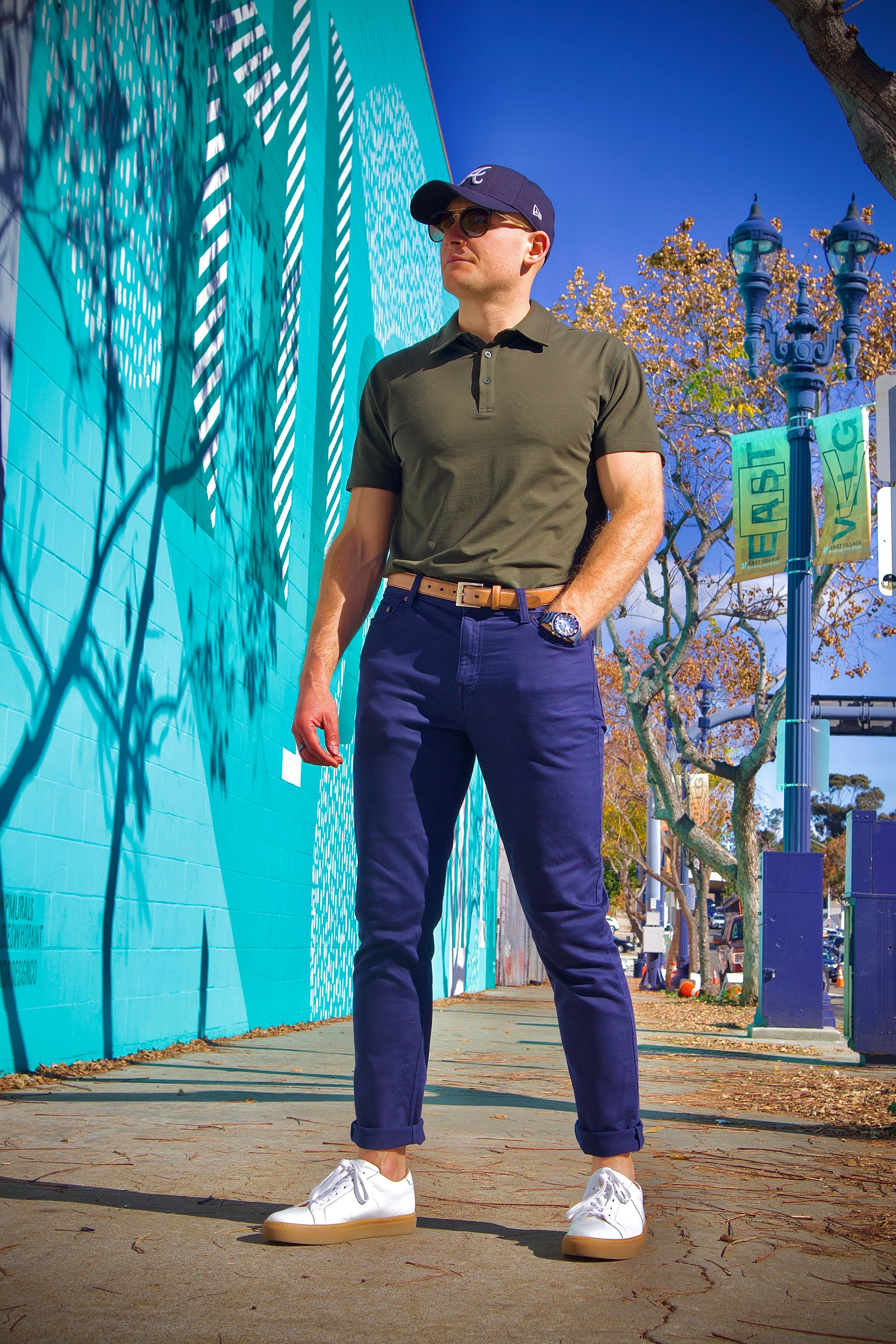 Low-contrast men can pull off both light and dark variations of low-contrast outfits and should make a point to opt for analogous colors (colors that sit next to each other on the color wheel) so long as they are taking their skin's undertone into account.