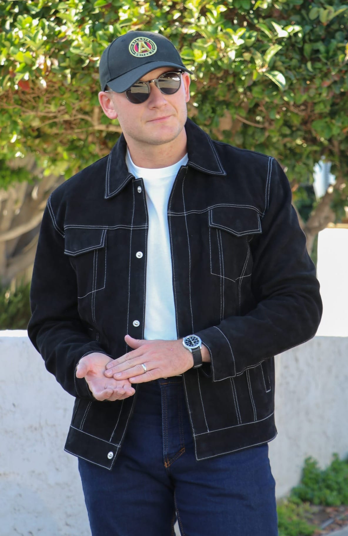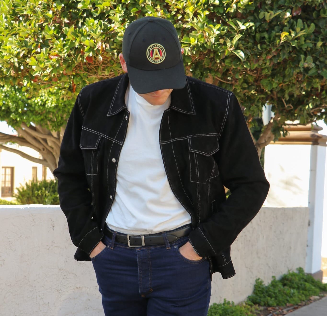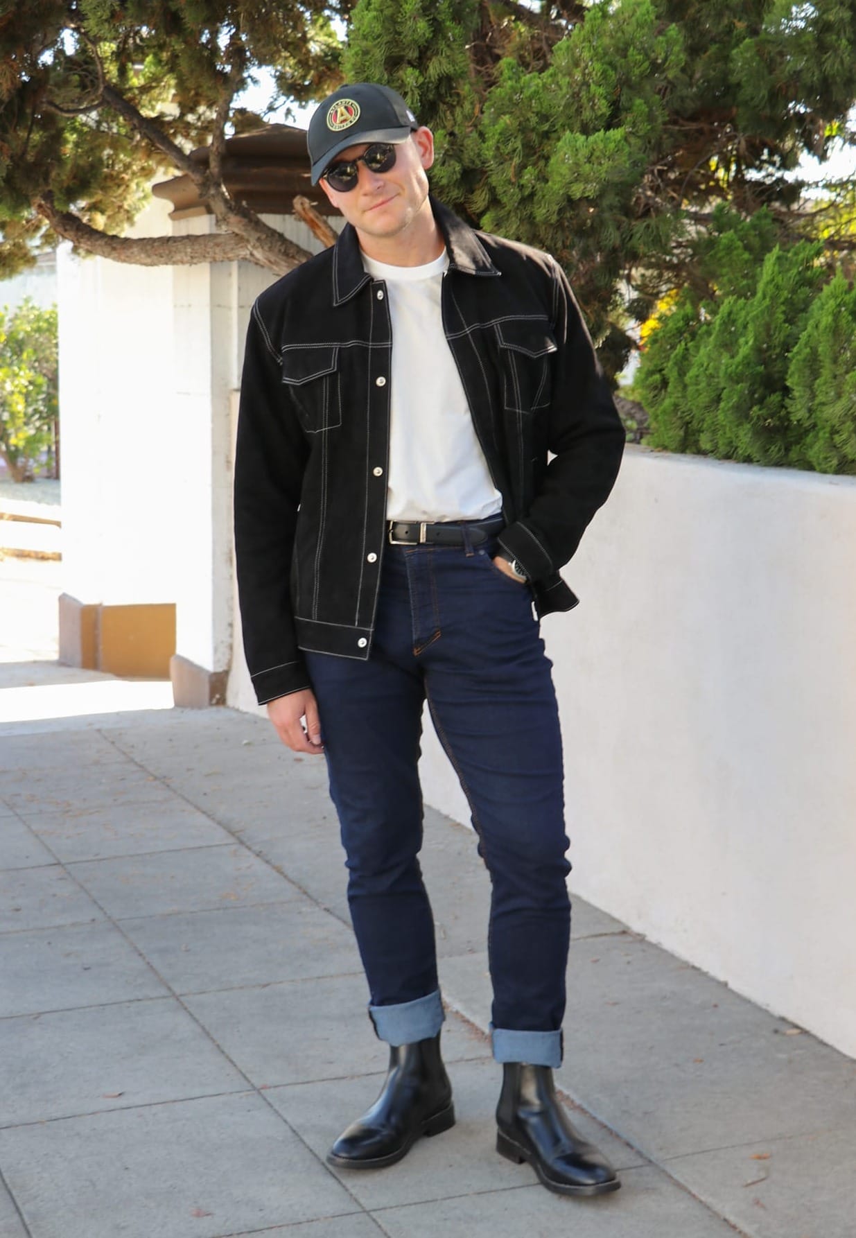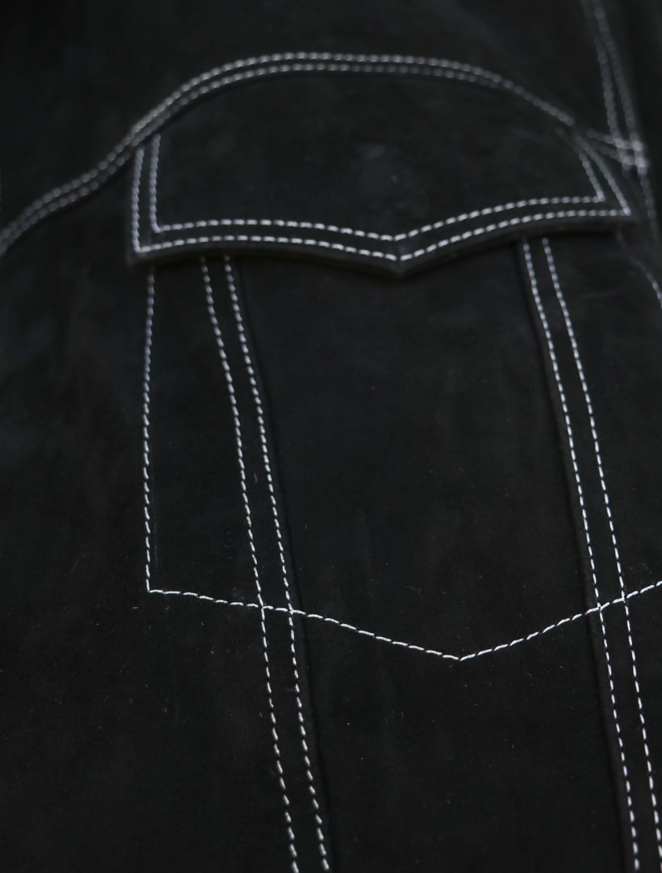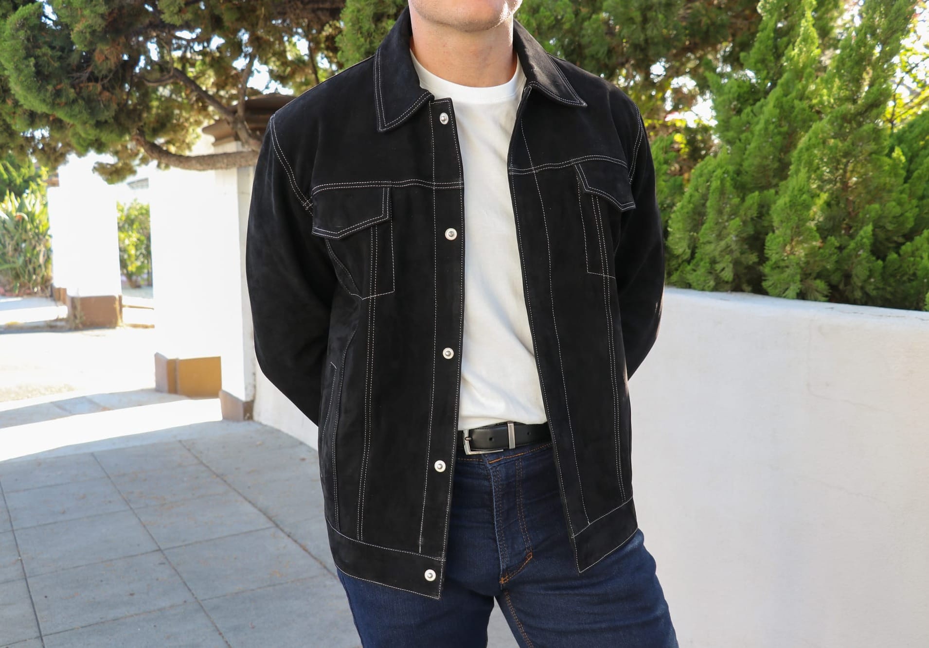 Ultimately, I chose this River Black Suede Trucker Jacket because I didn't have any black leather jackets in my collection, and I really love the look of a suede trucker jacket in general (although I'm not too fond of the white stitching throughout).