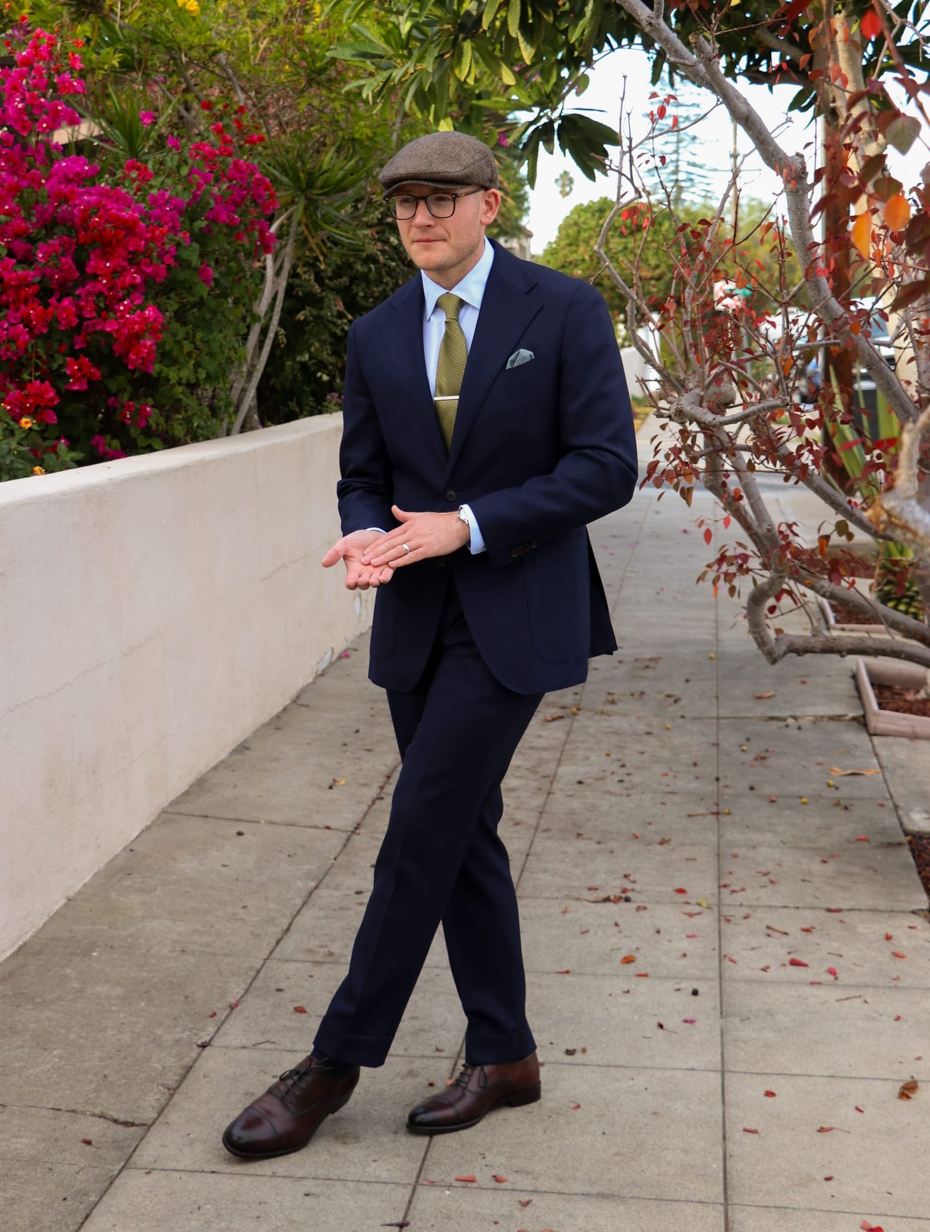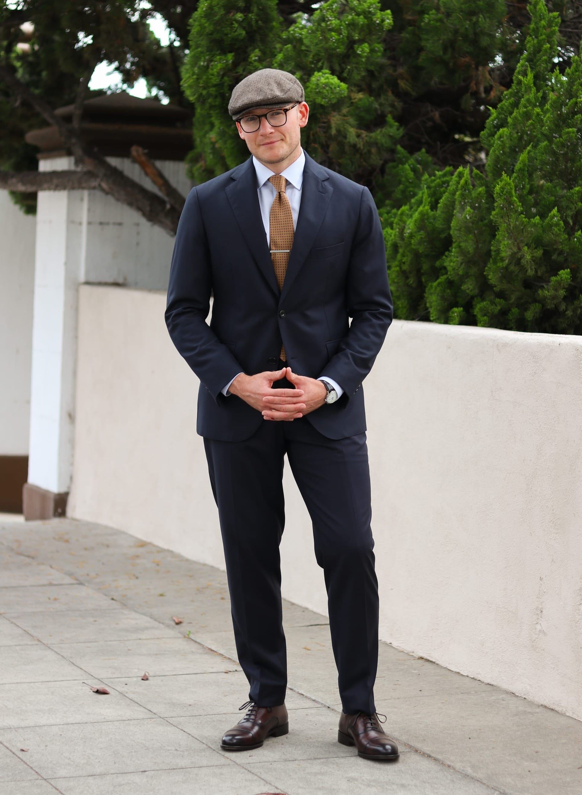 This adds consistency to the look in terms of color and pattern. On the feet, I've got a classic pair of brown cap-toe oxford dress shoes, which are always an excellent choice for a look like this.