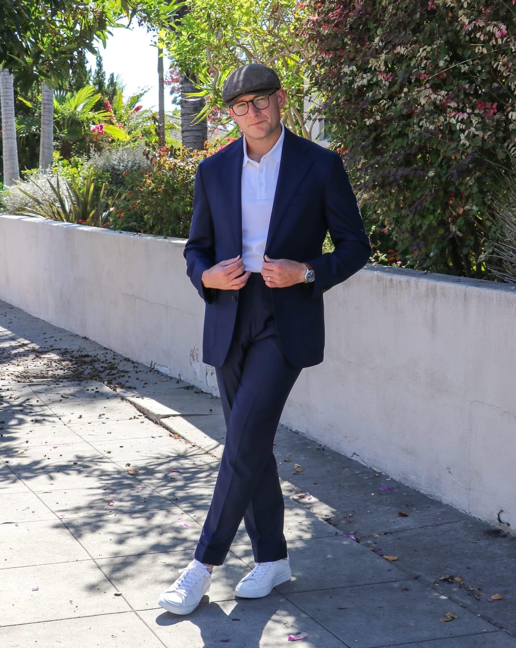 White sneakers and a suit are seldom easy to pull off.