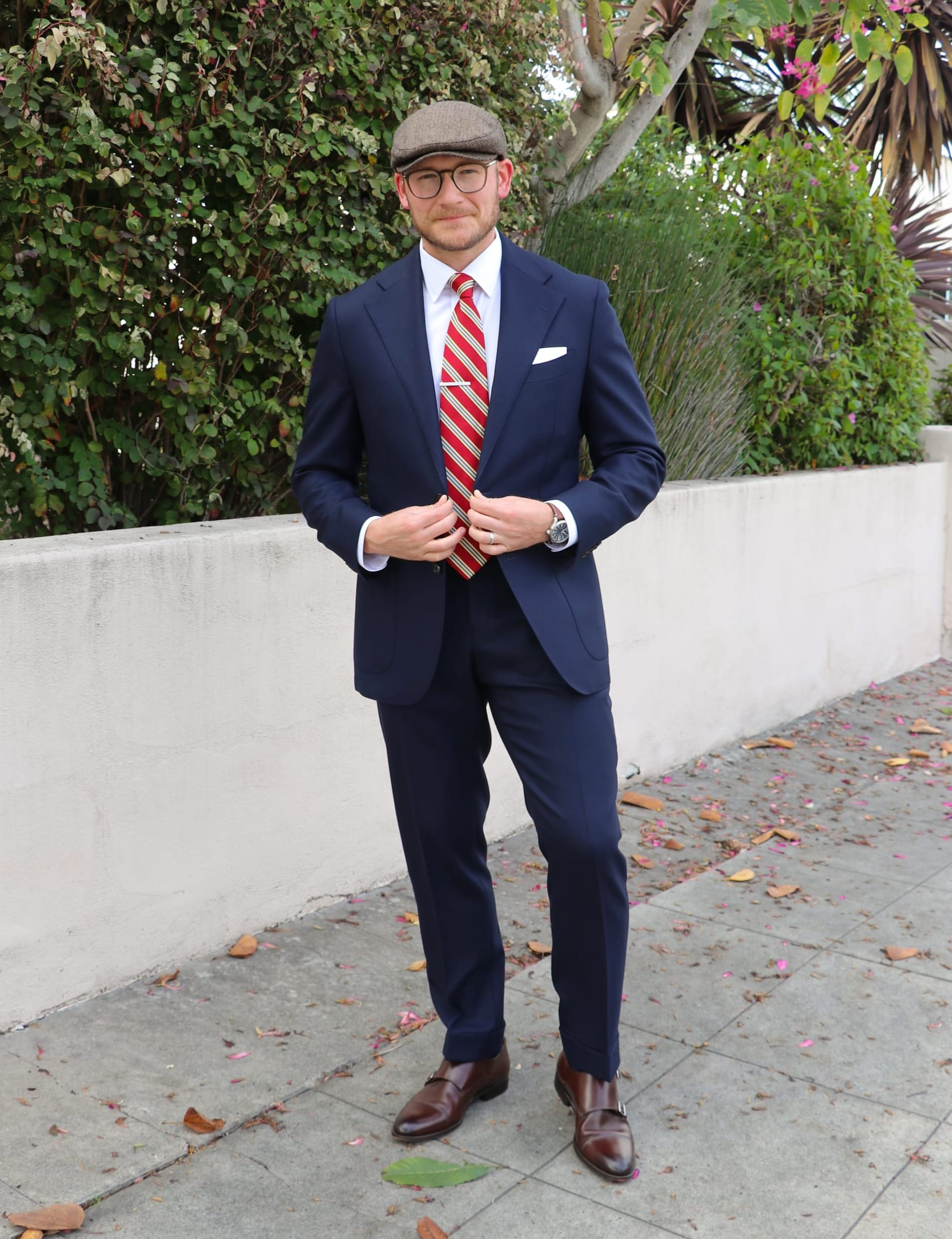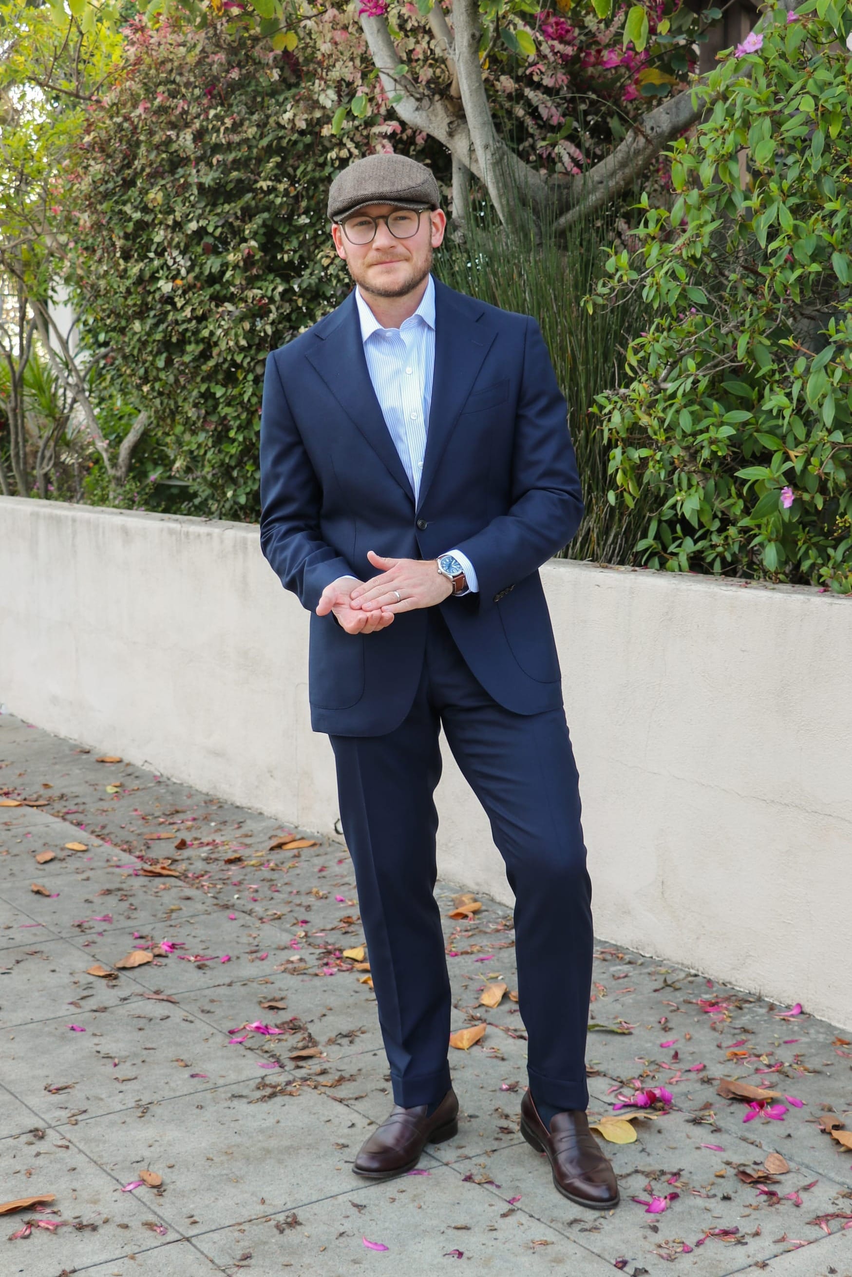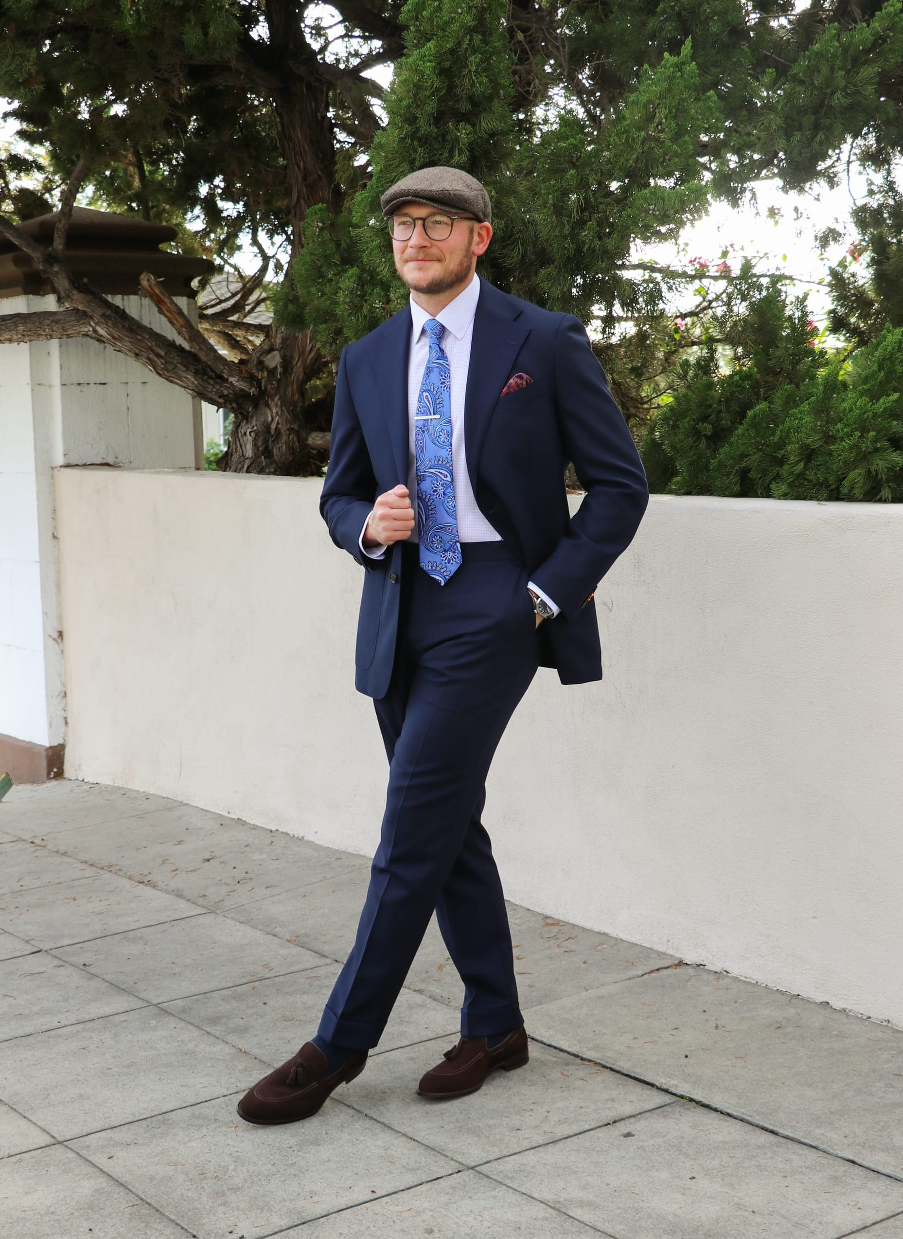 The blue and purple hues in the tie and shirt harmonize with the navy blue suit, resulting in an outfit that’s both fun and elegant. I've completed the look with deep brown, textured tassel loafers for a fun, casual vibe, as well as a tasteful wristwatch to add visual intrigue.