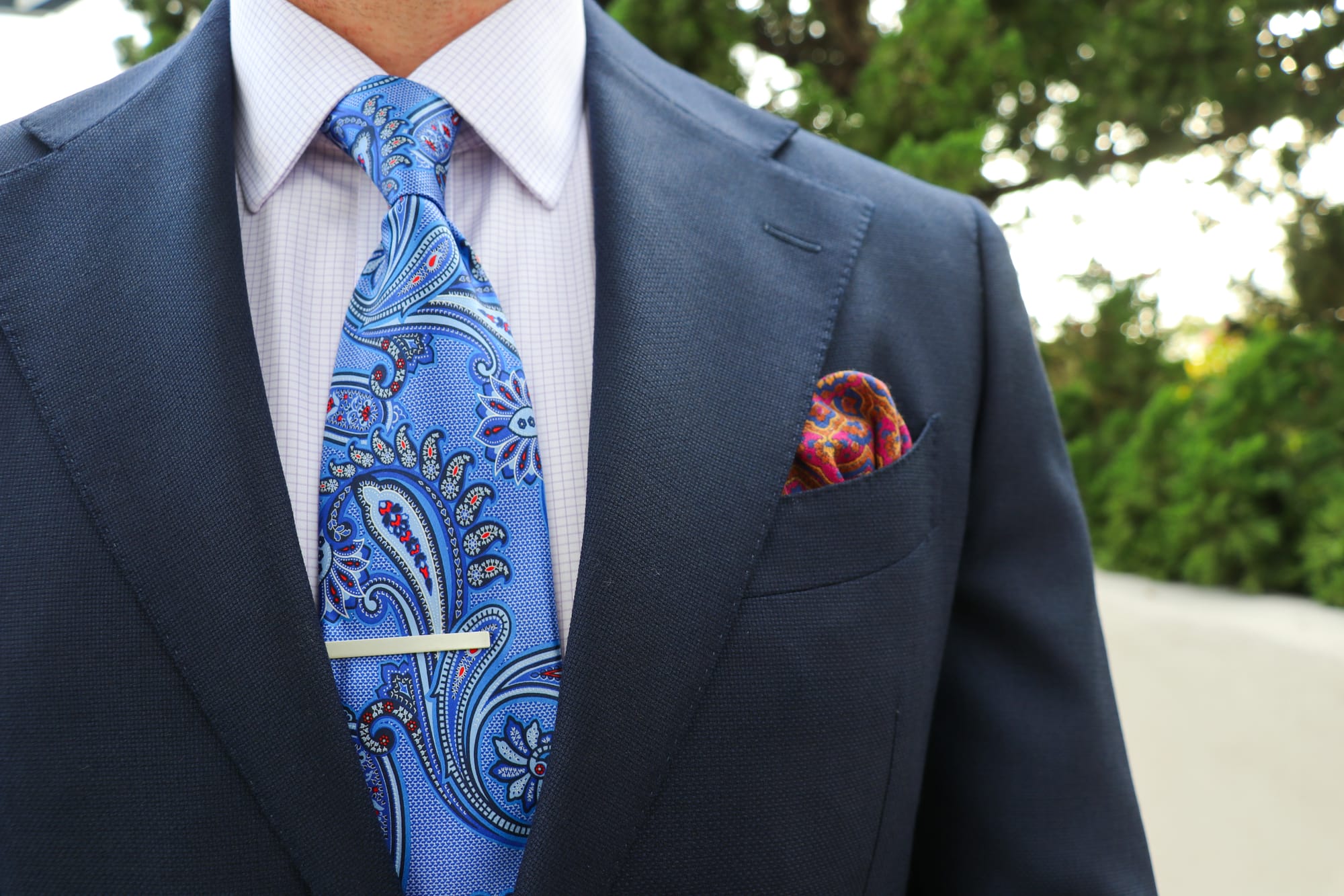 Paisley, especially in this navy-blue suit combination, can seem flashy and somewhat chaotic because of its intricate design. The secret to pairing patterns is ensuring there’s a CLEAR scale difference.