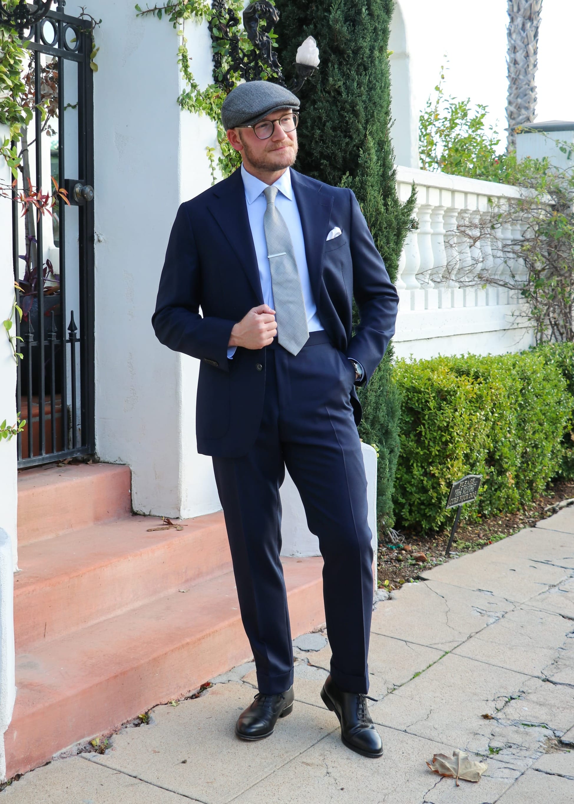 The subtle light blue shade looks especially charming when matched with a navy wool suit. My accessories include a stunning silvery glen plaid necktie, a classic tie clip, a handsome dress watch, and a timeless, shiny silk pocket square that any blushing bride would appreciate.