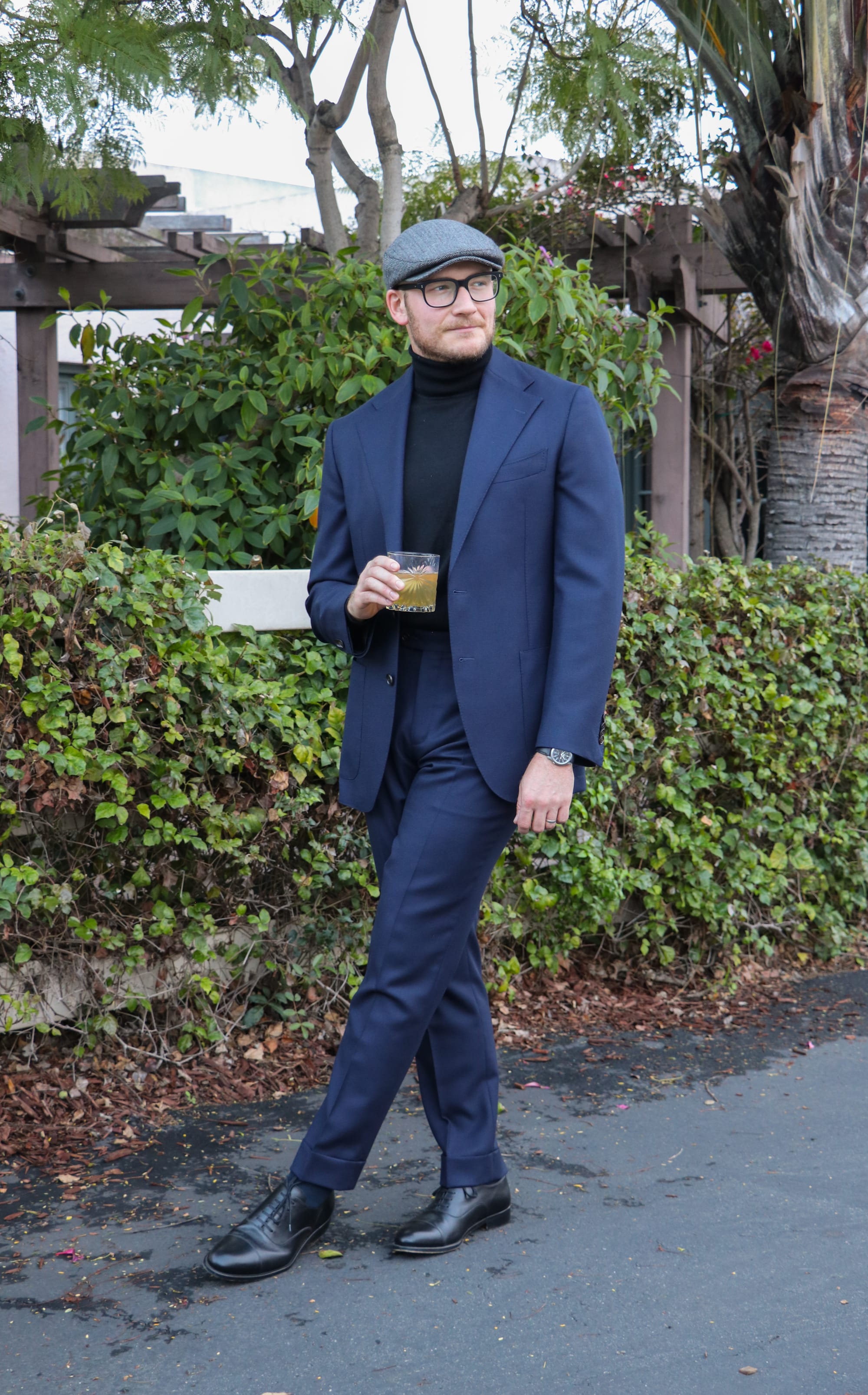 Here, I've ditched the dress shirts altogether in favor of a sleek, elegant wool turtleneck sweater. I've intentionally returned to the black cap-toe oxford dress shoes because I want to keep this color scheme simple: black and blue.