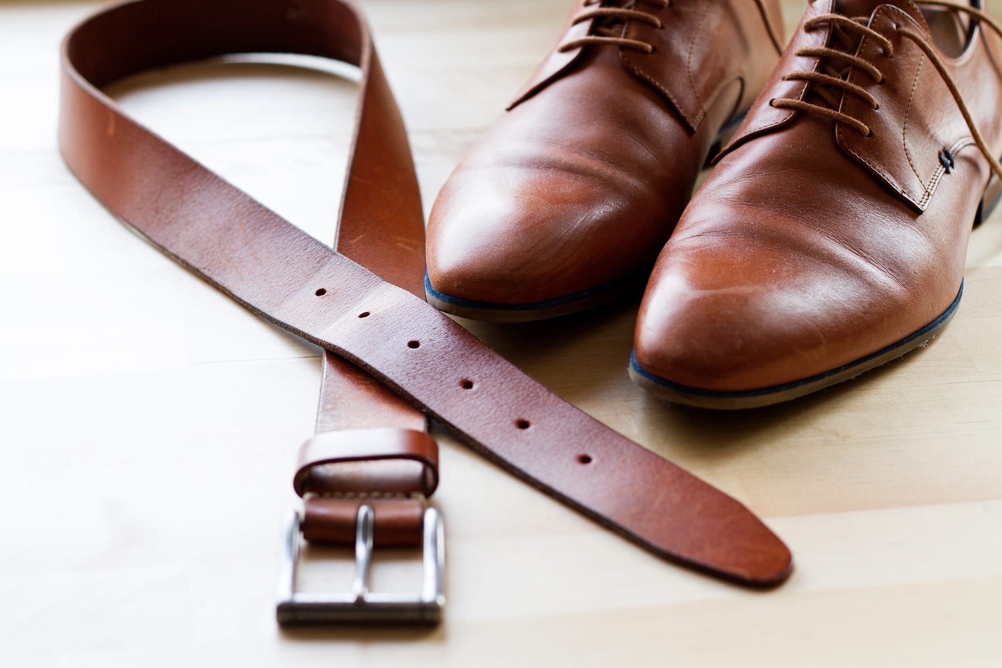 The belt color should match the suit color and should be the same as the color of your shoes. The hues may vary, but slightly. Additionally, match the belt buckle with other metal items in the outfit, i.e., cufflinks.