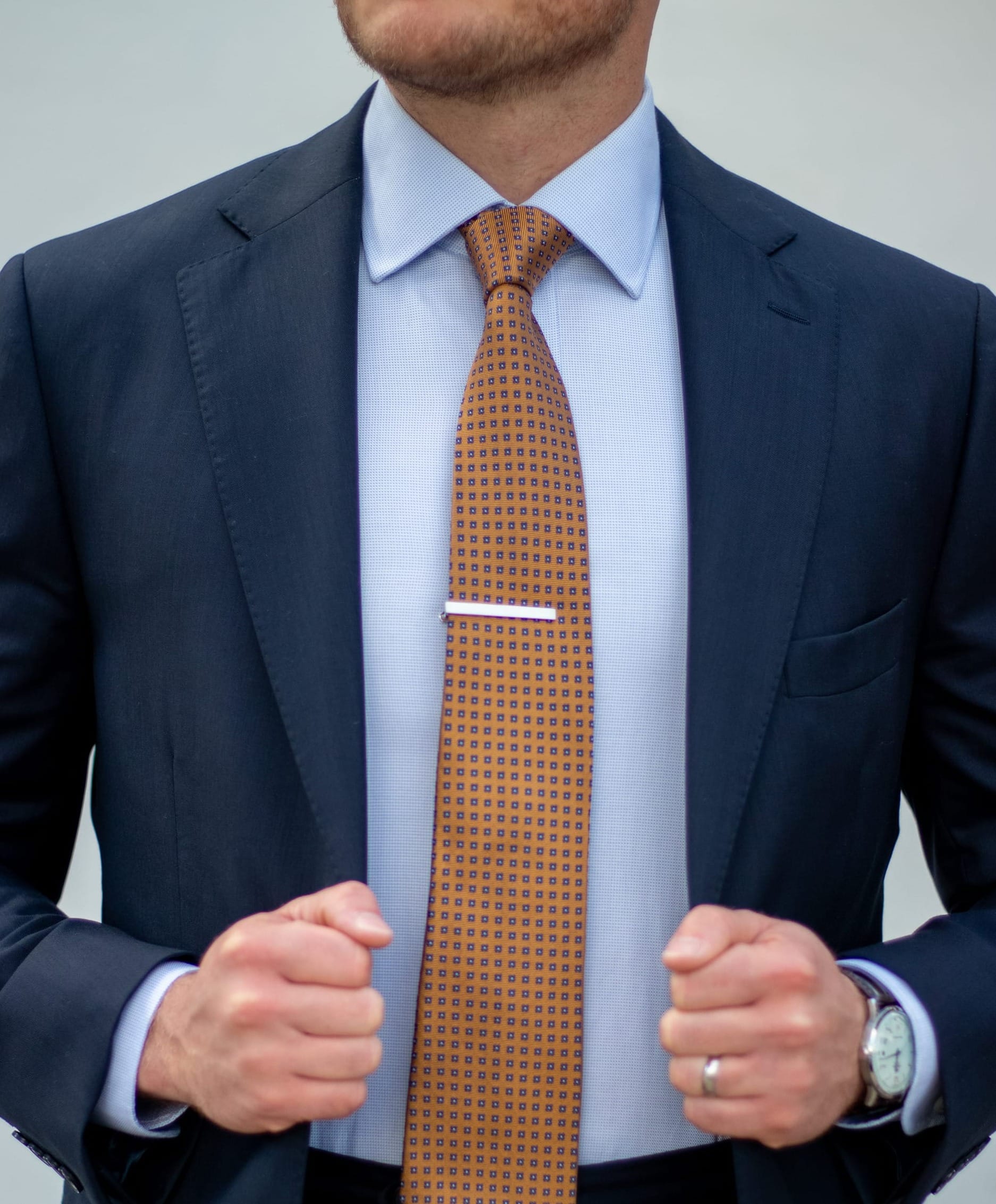 Among the ties, patterns are excellent for a semi-formal outfit. Some excellent options include regimental stripes, foulard, polka dot, and florals. In addition, navy, red, orange, and grey are suitable colors.