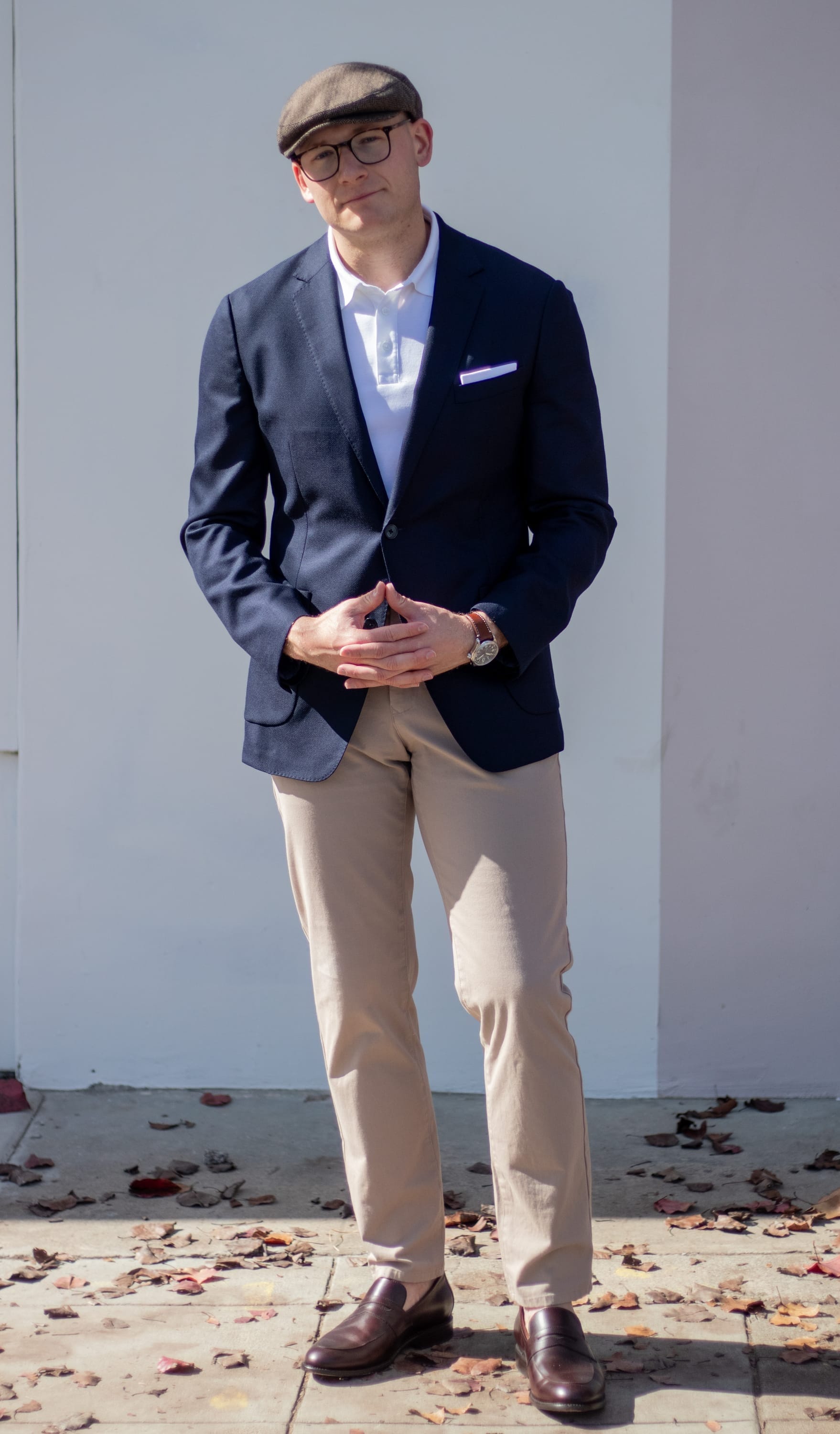 Blazers and pants that match the elegant mainstay of two-piece suits can work as a semi-formal outfit. Navy blazer and charcoal pants, for example. In fact, any shade of grey pants will make a perfect half-dress with the navy jacket.