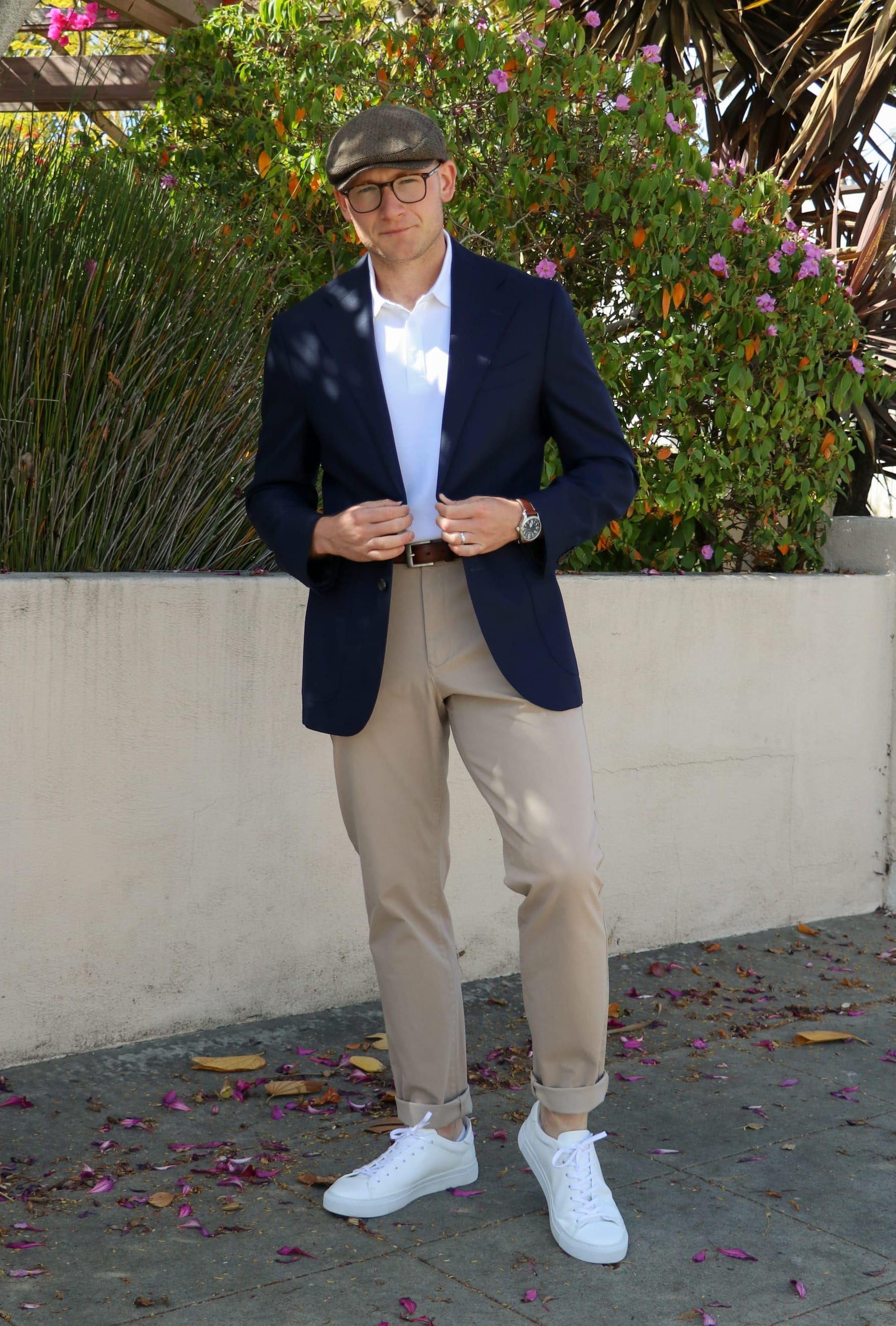 Adding clean white leather sneakers and cuffed khaki chinos may not be a style everyone can adopt at work. Still, depending on how your boss defines "business casual," this could be a great way to modernize and casualize a traditional business casual look while still firmly keeping it within the smart casual category of the business casual spectrum.