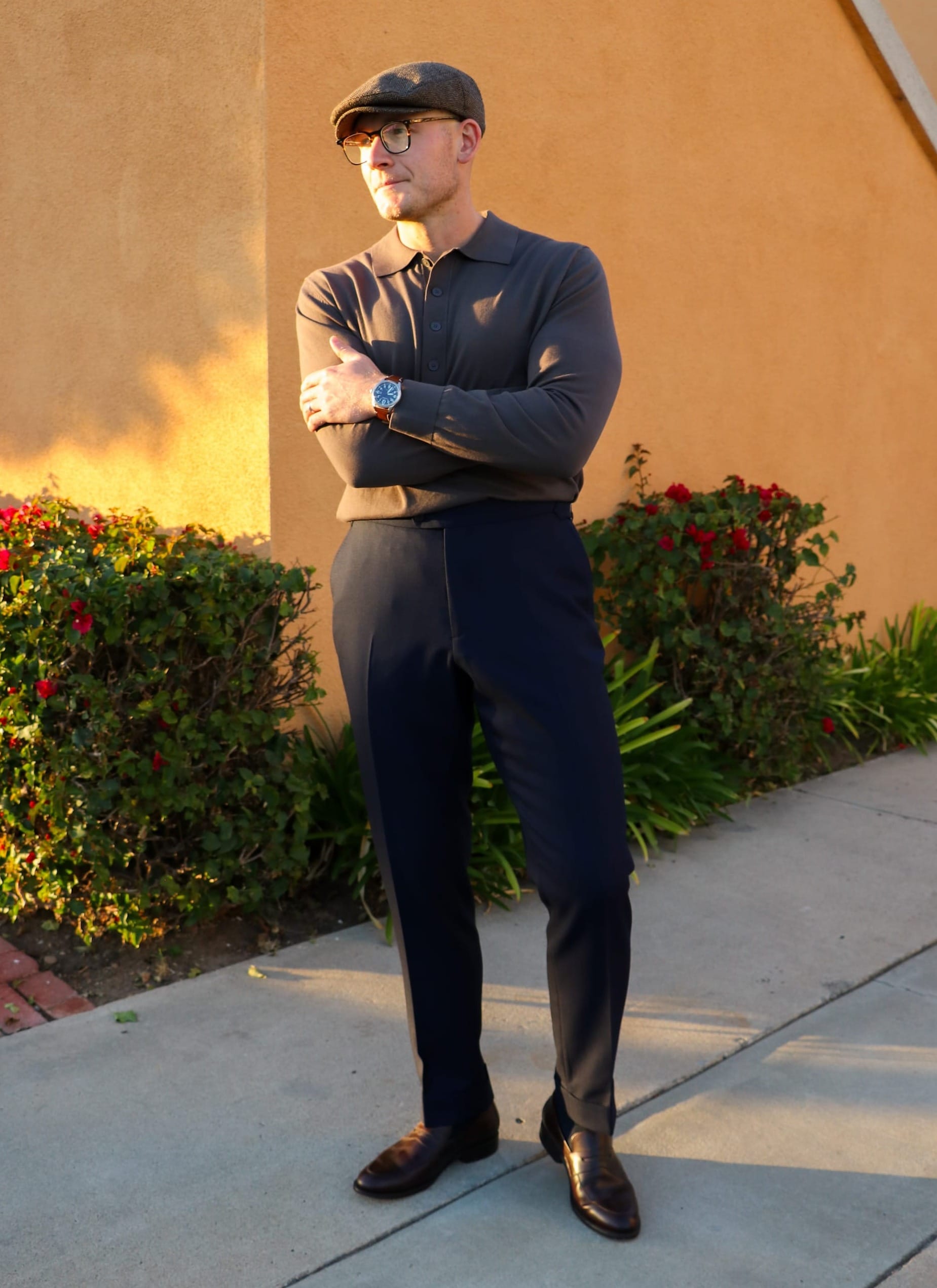 Here, we have the same outfit, but this time, it's a bit more formal with the addition of brown leather loafers. While not the most formal shoes, loafers are still an elegant and sophisticated choice that any man can benefit from owning.